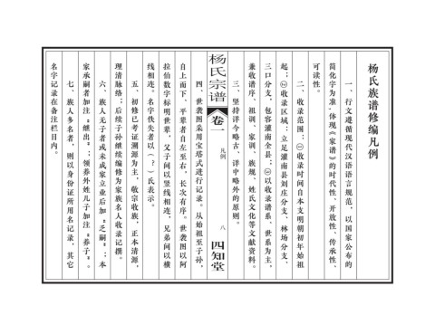 名字记录在备注栏目内。 家承嗣者加注 理清脉络;后续子孙继续编修为家族名人收录记撰。 线相连。名字佚失者以(?)氏表示。 拉伯数字标明世辈,父子间以竖线相连,兄弟间以横 自上而下、平辈者自左至右,长次有序。世袭图以阿 兼收谱序、祖训、家训、族规、姓氏文化等文献资料。 三口分支,包容灌南全县; 起; 可读性。 简化字为准 杨氏族谱修编凡例