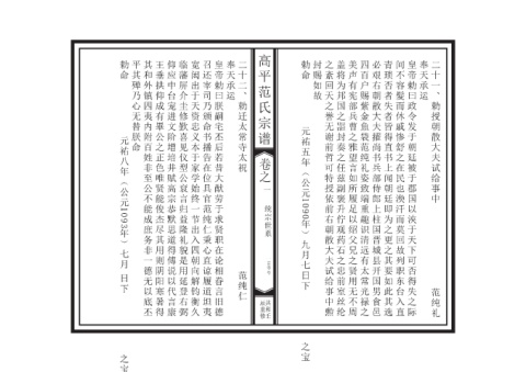 一 勅命 元祐五年 公元1090年 九月七日下 之宝 封赐如故 之紊回天之誉无谢前哲可特授依前右朝散大夫试给事中勲 盖将为邦国之噐封奏之任兹副褒升佇观药石之忠前室丝纶 美声有宪部兵曹之雅望言如所履足以绍父兄之贤用无不周 四百户赐紫金魚袋范纯礼姿致端重趣识清远有太常光禄之 必艰右朝散大夫擢尚书兵部侍郎上柱国晋城县开国男食邑 青琐否者失者皆得直书上闻朝廷即为之更之其要如此其选 间不容髮而休戚惨舒之在民也渙汗而莫回故列职东台入直 皇帝勅曰政令发于朝廷被于郡国以浹于天下可否得失之际 奉天承运 二十一 勅授朝散大夫试给事中 范纯礼
