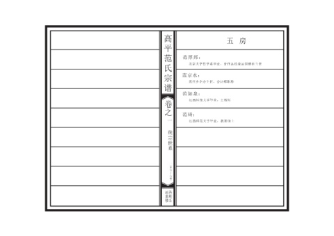 五 房 高 平 范厚邦: 北京大学哲学系毕业,曾任县经委县供销社主任 范 氏 范京水: 历任乡企办主任,会计师职称 宗 范如泉: 谱 江西师范大学毕业,工程师 范琦: 卷之 一 江西师范大学毕业,教育硕士 统 宗 世 系 一百七十七号 辰重修 共和壬