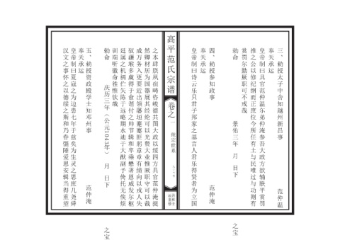 一 皇帝制曰诗云乐只君子邦家之基言人君乐得贤者为立国 奉天承运 四 勅授参知政事 范仲淹 勅命 景佑三年 月 日下 之宝 赏罚尔勤厥职可不戒哉 推之公以修纪纲而正庶位今所任有土与民唯过与功则有 皇帝制曰具官范仲温尓弟仲淹参吾大政方欲辅朕平赏罚 奉天承运 三 勅授太子中舍知越州新昌事 范仲温