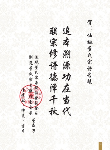 荆 楚 董 氏 宗 亲 董 联宗修谱德泽千秋 追本溯源功在当代 贺:仙桃董氏宗谱告竣 联 谊 荆楚分会 会 会 流坑董氏宗亲联谊会副会长 长 董本万 于辛丑·仲夏·吉日 13