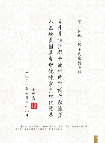 贺:仙桃三修董氏宗谱告竣 董观志 董观 志印 二○二一年七月二十八日 日升月恒江都堂盛世修宗谱千秋流芳 人杰地灵围桌台积德振家声世代隆昌 董观志,剅河夏场人,暨南大学教授,博士生导师,美国杨百翰大学访 问教授,旅游规划设计院副院长,著名旅游学者。 13