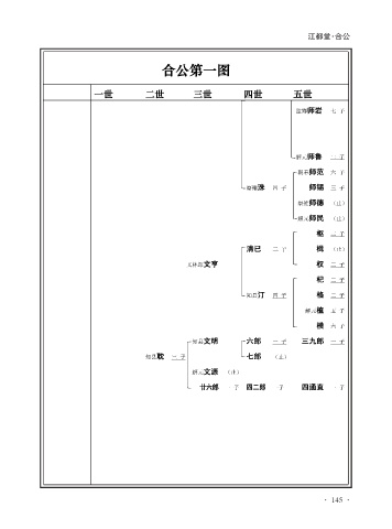 江都堂·合公 合公第一图 一世 二世 三世 四世 五世 监簿师岩 七 子 解元师鲁 二 子 朝奉师范 六 子 察推洙 四 子 师锡 三 子 察推师德 (止) 解元师民 (止) 枢 三 子 清已 三 子 楫 (止) 文林郎文亨 权 二 子 杞 二 子 知县汀 四 子 格 二 子 解元植 五 子 模 六 子 知县文明 六郎 一 子 三九郎 一 子 知县耽 三 子 七郎 (止) 解元文源 (止) 廿六郎 一 子 四二郎 一子 四通直 一 子 -11- · 145 ·