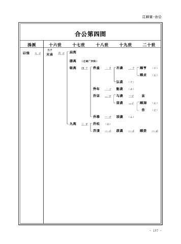 江都堂·合公 合公第四图 洙派 十六世 十七世 十八世 十九世 二十世 五子 以信 五 子 元吉 四 子 启高 德高 (迁湖广沔阳) 极高 四 子 乔孟 二 子 丕谟 二 子 顺亨 (止) 顺贞 (止) 弘谟 (止) 乔年 一 子 魁谟 (止) 乔坚 二 子 与谟 一子 言 显谟 二子 顺湖 (止) 舍 (止) 乔恭 一 子 顶谟 (止) 九高 二 子 乔松 (止) 乔清 一 子 质谟 一 子 顺贵 一 子 -8- · 157 ·