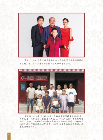董松, 一九七六年十二月十二日出生于仙桃市三伏潭镇苏湾村 十五组。于二零零三年创办仙桃市楚天彩印有限公司。 董观标, 1958年1月21日出生,住仙桃市剅河镇夏场街173号, 周岁失母、八岁丧父。靠祖母抚养成人,1965年至1974年在夏场读 小学、初中。1974年至1983年在夏场五组当小组会计,1983年至 2000年在剅河镇夏场机械厂工作。2000年至今在本地承包农田,从 事农业种植工作。 20
