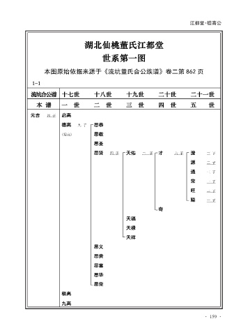 江都堂·德高公 湖北仙桃董氏江都堂 世系第一图 本图原始依据来源于《流坑董氏合公族谱》卷二第 862 页 1-1 流坑合公谱 十七世 十八世 十九世 二十世 二十一世 本 谱 一 世 二 世 三 世 四 世 五 世 元吉 四 子 启高 德高 九 子 思恭 (得高) 思敬 思圣 思贤 四 子 天佑 二 子 才 六 子 澄 三 子 源 二 子 通 三 子 荣 一 子 旺 二 子 聪 一 子 奇 天福 天禄 天祥 思义 思贵 思富 思华 思荣 极高 九高 -1- · 159 ·