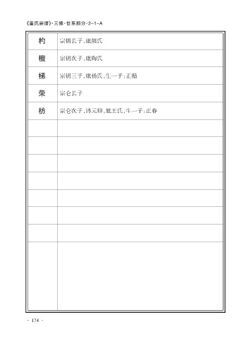 《董氏宗谱》·三修·世系部分·2-1-A 杓 宗钥长子,妣熊氏 檀 宗钥次子,妣陶氏 梯 宗钥三子,妣杨氏,生一子:正循 荣 宗仑长子 枋 宗仑次子,讳元卿,妣王氏,生一子:正春 · 174 ·