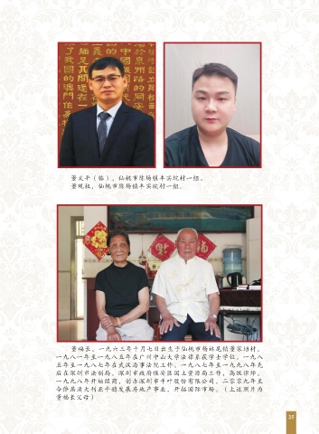 董义平(临),仙桃市陈场镇丰实垸村一组。 董观权,仙桃市陈场镇丰实垸村一组。 董福长, 一九六三年十月七日出生于仙桃市杨林尾镇董家垱村。 一九八一年至一九八五年在广州中山大学法律系获学士学位。一九八 五年至一九八七年在武汉海事法院工作。一九八七年至一九九八年先 后在深圳市法制局、深圳市政府保安区国土资源局工作,高级律师。 一九九八年开始经商,创办深圳市平叶股份有限公司。二零零九年至 今侨居澳大利亚平稳发展房地产事业,开拓国际市场。(上述照片为 董福长父母) 25