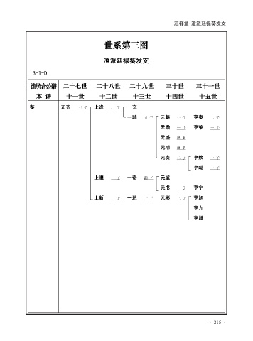 江都堂·澄派廷禄葵发支 世系第三图 澄派廷禄葵发支 3-1-D 流坑合公谱 二十七世 二十八世 二十九世 三十世 三十一世 本 谱 十一世 十二世 十三世 十四世 十五世 葵 正齐 三 子 上逢 二 子 一充 一琏 五 子 元魁 一 子 亨泰 二 子 元鼎 一 子 亨荣 一 子 元盛 出 嗣 元明 出 嗣 元贞 二 子 亨焕 一 子 亨聪 一 子 上遵 一 子 一奇 嗣 子 元盛 元书 一 子 亨宇 上新 一 子 一达 一 子 元彬 三 子 亨旭 亨九 亨馗 · 215 · -4-