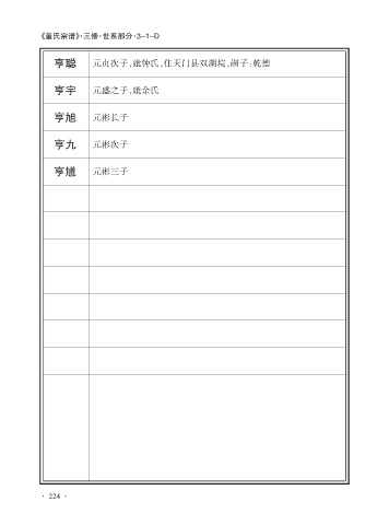 《董氏宗谱》·三修·世系部分·3-1-D 亨聪 元贞次子,妣钟氏,住天门县双湖垸,嗣子:乾德 亨宇 元盛之子,妣余氏 亨旭 元彬长子 亨九 元彬次子 亨馗 元彬三子 · 224 ·