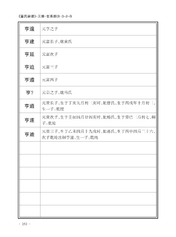 《董氏宗谱》·三修·世系部分·3-2-B 亨遑 元亨之子 亨建 元富长子,妣黄氏 亨延 元富次子 亨迫 元富三子 亨遵 元富四子 亨? 元荣之子,妣马氏 元贵长子,生于丁亥九月初三亥时,妣曾氏,生于丙戌年十月初三, 亨遴 生一子:乾绶 元贵次子,生于壬辰四月廿四亥时,妣杨氏,生于癸已三月初七,嗣 亨遂 子:乾纶 元贵三子,生于乙未四月十九戌时,妣蒋氏,生于丙申四月二十六, 亨迪 次子乾纶出嗣亨遂,生一子:乾纯 · 252 ·