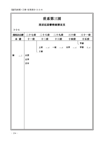 《董氏宗谱》·三修·世系部分·3-3-A 世系第三图 澄派廷梁攀懋鹿禁发支 3-3-A 流坑合公谱 二十七世 二十八世 二十九世 三十世 三十一世 本 谱 十一世 十二世 十三世 十四世 十五世 亨盛 上钦 一 子 一能 一 子 元亨 一 子 亨智 五 子 上省 禁 三 子 正贯 正学 正宇 -2- · 254 ·