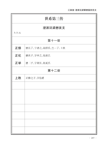 江都堂·澄派廷梁攀懋鹿禁发支 世系第三传 澄派廷梁懋发支 3-3-A 第十一世 正修 懋长子,字清之,妣舒氏,生一子:上秩 正化 懋次子,字申之,妣张氏 正举 懋三子,字寅长,妣夏氏 第十二世 上秩 正修之子,字伯爵 · 257 ·
