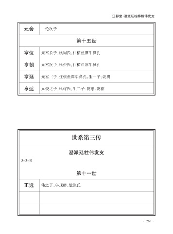江都堂·澄派廷柱棒檽伟发支 元会 一伦次子 第十五世 亨位 元富长子,妣周氏,住横鱼潭牛鼻孔 亨朝 元富次子,妣张氏,住横鱼潭牛鼻孔 亨廷 元富三子,住横鱼潭牛鼻孔,生一子:乾明 亨适 元俊之子,妣许氏,生二子:乾忠、乾德 世系第三传 澄派廷柱伟发支 3-3-B 第十一世 正选 伟之子,字现卿,妣张氏 · 265 ·
