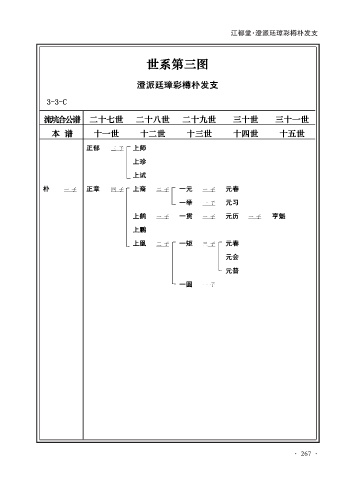 江都堂·澄派廷璋彩樽朴发支 世系第三图 澄派廷璋彩樽朴发支 3-3-C 流坑合公谱 二十七世 二十八世 二十九世 三十世 三十一世 本 谱 十一世 十二世 十三世 十四世 十五世 正郁 三 子 上师 上珍 上试 朴 一 子 正章 四 子 上裔 二 子 一元 一 子 元春 一举 一 子 元习 上鹤 一 子 一贯 一 子 元历 一 子 亨魁 上鹏 上凰 二 子 一矩 三 子 元春 元会 元普 一圆 一 子 -2- · 267 ·