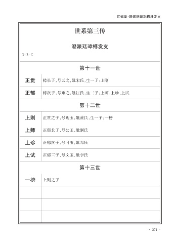 江都堂·澄派廷璋彩樽朴发支 世系第三传 澄派廷璋樽发支 3-3-C 第十一世 正贯 樽长子,号云之,妣宋氏,生一子:上刚 正郁 樽次子,号重之,妣汪氏,生三子:上师、上珍、上试 第十二世 上则 正贯之子,号现玉,妣黄氏,生一子:一榜 上师 正郁长子,号公玉,妣别氏 上珍 正郁次子,号时玉,妣邓氏 上试 正郁三子,号文玉,妣李氏 第十三世 一榜 上则之子 · 271 ·