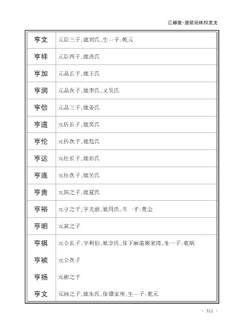 亨文 元颖之子,妣朱氏,住谭家坝,生一子:乾元