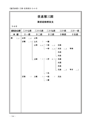 《董氏宗谱》·三修·世系部分·3-4-B 世系第三图 澄派廷栋柄发支 3-4-B 流坑合公谱 二十七世 二十八世 二十九世 三十世 三十一世 本 谱 十一世 十二世 十三世 十四世 十五世 柄 三 子 正明 一 子 上铭 正曙 三 子 上义 一 子 一壁 上信 二 子 一举 一 子 元海 一学 三 子 元吉 一 子 亨秀 元旦 元益 上昭 二 子 一齐 四 子 元遂 元遐 元茂 元逯 一 子 亨才 一 子 一名 正朝 一 子 上植 二 子 一进 一 子 元达 一赛 -1- · 314 ·