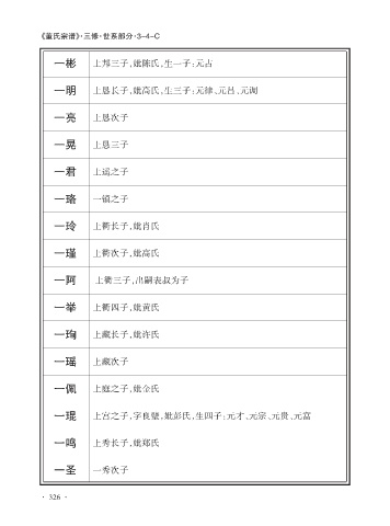 《董氏宗谱》·三修·世系部分·3-4-C 一彬 上邦三子,妣陈氏,生一子:元占 一明 上恳长子,妣高氏,生三子:元律、元吕、元调 一亮 上恳次子 一晃 上恳三子 一君 上遥之子 一珞 一镇之子 一玲 上衢长子,妣肖氏 一瑾 上衢次子,妣高氏 一阿 上衢三子,出嗣表叔为子 一举 上衢四子,妣黄氏 一珣 上藏长子,妣许氏 一瑶 上藏次子 一佩 上庭之子,妣金氏 一琨 上宫之子,字良壁,妣彭氏,生四子:元才、元宗、元贵、元富 一鸣 上秀长子,妣郑氏 一圣 一秀次子 · 326 ·