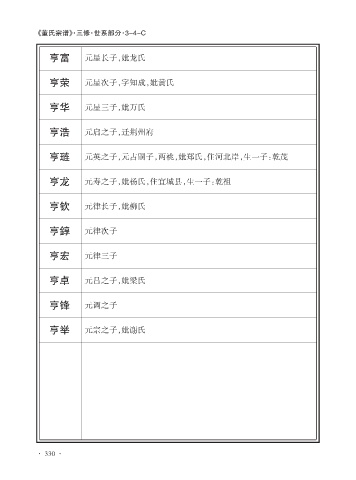 《董氏宗谱》·三修·世系部分·3-4-C 亨富 元星长子,妣龙氏 亨荣 元星次子,字知成,妣黄氏 亨华 元星三子,妣万氏 亨浩 元启之子,迁荆州府 亨琏 元英之子,元占嗣子,两祧,妣郑氏,住河北岸,生一子:乾茂 亨龙 元寿之子,妣杨氏,住宜城县,生一子:乾祖 亨钦 元律长子,妣柳氏 亨錞 元律次子 亨宏 元律三子 亨卓 元吕之子,妣梁氏 亨锋 元调之子 亨举 元宗之子,妣谢氏 · 330 ·