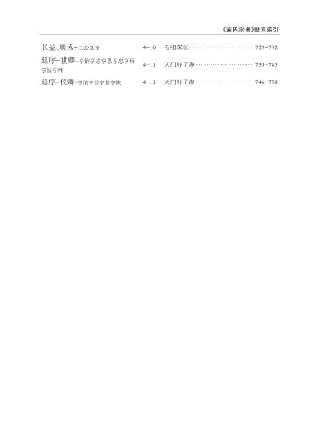《董氏宗谱》世系索引 长益、履秀-二公发支 4-10 毛咀深江 ………………………… 729-732 廷序-世卿-亨怡亨志亨思亨忠亨标 4-11 天门虾子湖 ……………………… 733-745 亨恒亨性 廷序-仪卿-亨情亨恮亨悱亨恢 4-11 天门虾子湖 ……………………… 746-758