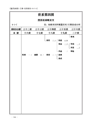 《董氏宗谱》·三修·世系部分·4-1-C 世系第四图 澄派廷䘵概发支 4-1-C 住:仙桃市剅河镇董庄村/江陵县老台河 流坑合公谱 三十二世 三十三世 三十四世 三十五世 三十六世 本 谱 十六世 十七世 十八世 十九世 二十世 萃鸿 泰受 三 子 勋益 出 嗣 举益 二 子 萃扬 一 子 萃显 一 子 杰益 一 子 萃魁 乾瑚 一 子 履豪 嗣 子 泰溶 二 子 益美 益成 -2- · 388 ·