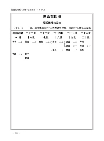 《董氏宗谱》·三修·世系部分·4-1-D、E 世系第四图 澄派廷䘵格发支 4-1-D、E 住:剅河镇董庄村/三伏潭镇官岭村、双剅村/江陵县宏家场 流坑合公谱 三十二世 三十三世 三十四世 三十五世 三十六世 本 谱 十六世 十七世 十八世 十九世 二十世 亨举 一 子 乾连 一 子 履安 二 子 泰明 二 子 富益 一 子 萃恺 文益 嗣 子 萃镐 嗣 子 泰光 一 子 本益 一 子 萃桂 亨源 二 子 乾圣 乾远 -4- · 396 ·