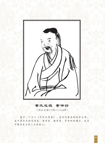 董氏远祖 董仲舒 (约公元前176年——104年) 董子,广川人(今河北景县),是汉代著名的经学大师, 是中国古代的思想家、哲学家、教育家,景帝时任博士,也是 中国历史上第二文化圣人。 05