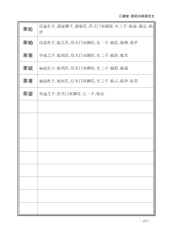 江都堂·澄派廷禄葵发支 汉益长子,谦益嗣子,妣徐氏,住天门双湖垸,生三子:临远、临忠、临 萃松 祥 萃柏 汉益次子,妣王氏,住天门双湖垸,生三子:临浩、临辉、临平 萃南 学益之子,妣刘氏,住天门双湖垸,生二子:临仿、临美 萃斌 福益长子,妣刘氏,住天门双湖垸,生二子:临稳、临成 萃甫 福益次子,妣何氏,住天门双湖垸,生三子:临元、临华、临荣 萃望 寿益之子,住天门双湖垸,生一子:临宗 · 477 ·