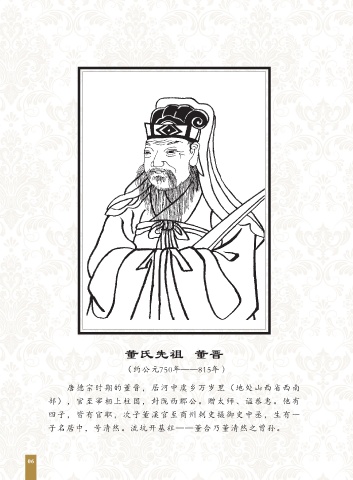 董氏先祖 董晋 (约公元750年——815年) 唐德宗时期的董晋,居河中虞乡万岁里(地处山西省西南 部),官至宰相上柱国,封陇西郡公。赠太师、谥恭惠。他有 四子,皆有官职,次子董溪官至商州刺史摄御史中丞,生有一 子名居中,号清然。流坑开基祖——董合乃董清然之曾孙。 06
