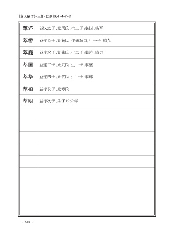 《董氏宗谱》·三修·世系部分·4-7-D 萃还 益汉之子,妣周氏,生二子:临国、临军 萃桥 益连长子,妣杨氏,住通海口,生一子:临茂 萃庭 益连次子,妣张氏,生二子:临涛、临勇 萃国 益连三子,妣刘氏,生一子:临盛 萃华 益连四子,妣代氏,生一子:临郁 萃柏 益禄长子,妣章氏 萃明 益禄次子,生于1969年 · 618 ·