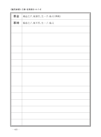 《董氏宗谱》·三修·世系部分·4-7-E 萃全 瑞益之子,妣景氏,生一子:临义(两祧) 萃坤 銮益之子,妣王氏,生一子:临支 · 622 ·