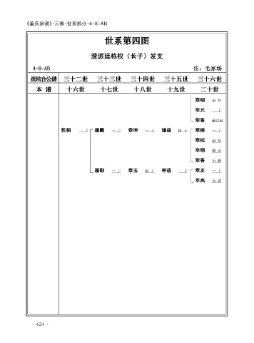 《董氏宗谱》·三修·世系部分·4-8-AB 世系第四图 澄派廷栋权(长子)发支 4-8-AB 住:毛家场 流坑合公谱 三十二世 三十三世 三十四世 三十五世 三十六世 本 谱 十六世 十七世 十八世 十九世 二十世 萃明 嗣 孙 萃元 二 子 萃香 嗣曾孙 乾相 二 子 履鹏 一 子 泰坤 一 子 谦益 四 子 萃椿 一 子 萃棺 嗣 孙 萃明 嗣 孙 萃香 出 嗣 履勤 一 子 泰玉 嗣 子 举益 二 子 萃友 一 子 萃高 出 嗣 · 624 · -2-