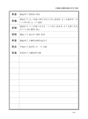 江都堂·澄派廷栋权(长子)发支 萃香 楠益四子,嗣曾孙:泽民 谦益长子,生于光绪乙酉正月初六已时,妣胡氏,生于光绪癸未二月 萃椿 二十四午时,生一子:福临 谦益次子,生于光绪丁亥九月二十八亥时,妣肖氏,生于光绪丁亥九 萃棺 月十八丑时,嗣孙:观云 萃明 谦益三子,妣王氏,嗣孙:观圣 萃香 谦益四子,出嗣简家桥仕益为子 萃友 举益长子,妣高氏,生一子:金临 萃高 举益次子,出嗣苏姓为婿 · 629 ·
