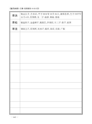《董氏宗谱》·三修·世系部分·4-8-CD 银益长子,生未详,卒于 2016 年 10 月 16 日,妣郑东香,生于 1937 年 萃洪 11月4日,住别湾,生三子:临新、树临、保临 萃松 银益次子,金益嗣子,妣段氏,住别湾,生二子:临平、临界 萃法 铜益之子,住别湾,生四子:临兵、临汉、汉临、广临 · 642 ·