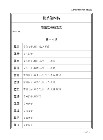 江都堂·澄派廷栋植发支 世系第四传 澄派廷栋植发支 4-9-AB 第十六世 乾宗 亨善之子,妣邹氏,又罗氏 乾贵 亨江长子 乾富 亨江次子,妣许氏,生一子:履寿 乾作 亨江三子,妣周氏,生一子:履福 乾化 亨禄长子,妣丁氏,生二子:履运、履述 乾佳 亨禄次子,妣姜氏,生一子:履遥 乾仁 亨惠之子,妣毛氏,生二子:履璜、履璠 乾恪 亨寿长子,妣郑氏 乾国 亨寿次子 乾成 亨权之子 乾信 亨炳之子 乾保 亨烂长子 · 667 ·