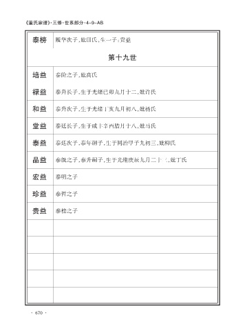 《董氏宗谱》·三修·世系部分·4-9-AB 泰榜 履华次子,妣田氏,生一子:贵益 第十九世 培益 泰阶之子,妣高氏 禄益 泰升长子,生于光绪已卯九月十二,妣许氏 和益 泰升次子,生于光绪丁亥九月初八,妣杨氏 堂益 泰廷长子,生于咸丰辛酉腊月十八,妣马氏 泰益 泰廷次子,泰年嗣子,生于同治甲子九初三,妣枊氏 品益 泰级之子,泰升嗣子,生于光绪庚辰九月二十三,妣丁氏 宏益 泰明之子 珍益 泰哲之子 贵益 泰榜之子 · 670 ·