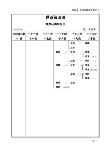 江都堂·澄派廷瑞桅亨冕发支 世系第四图 澄派廷瑞桅发支 4-10-A 住:十全垸 流坑合公谱 三十二世 三十三世 三十四世 三十五世 三十六世 本 谱 十六世 十七世 十八世 十九世 二十世 益谦 一 子 萃南 益桂 泰升 二 子 益椿 二 子 萃福 萃玉 嗣 子 益振 一 子 萃财 一 子 泰隆 二 子 益登 二 子 萃复 二 子 萃堂 嗣子祥临 益清 二 子 萃炳 萃香 一 子 泰陆 一 子 益浩 泰培 出嗣履贤 -3- · 693 ·
