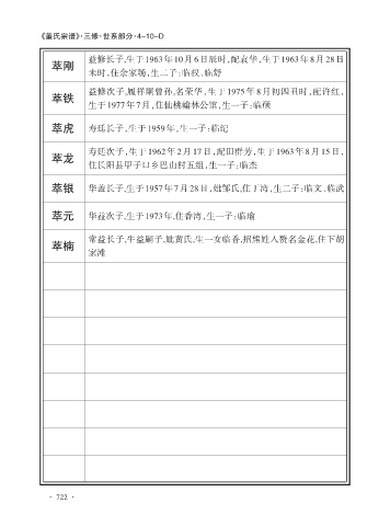 萃银 华盖长子,生于1957年7月28日,妣邹氏,住丁湾,生二子:临文、临武