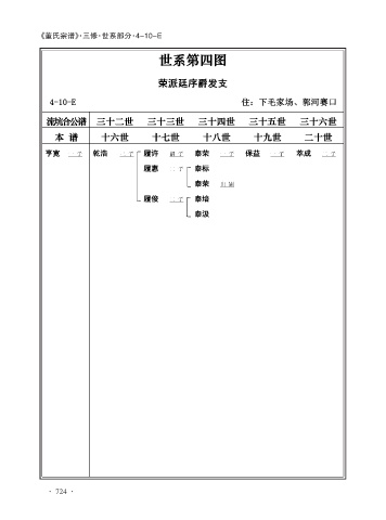 《董氏宗谱》·三修·世系部分·4-10-E 世系第四图 荣派廷序爵发支 4-10-E 住:下毛家场、郭河赛口 流坑合公谱 三十二世 三十三世 三十四世 三十五世 三十六世 本 谱 十六世 十七世 十八世 十九世 二十世 亨宽 一 子 乾浩 三 子 履许 嗣 子 泰荣 一 子 保益 一 子 萃成 二 子 履惠 二 子 泰标 泰荣 出 嗣 履俊 二 子 泰培 泰汲 -2- · 724 ·