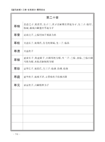 《董氏宗谱》·三修·世系部分·履秀发支 第二十世 忠益之子,妣张氏,生子二,次子出嗣董庄萃起为子,生二子:临付、 萃柏 临斌,临斌出嗣董庄萃起为子 萃荣 运益之子,立临付四子观高为孙 萃松 文益长子,妣秦氏,住毛咀梁城,生一子:临洪 萃清 文益次子 益富长子,钦益嗣子,出嗣邓姓为婿,生二子:兰临、水临,兰临出嗣 萃银 马姓为婿,水临出嗣杨姓为婿 萃珍 益华长子,妣徐氏,生三子:临清、临桃、临源 萃庭 益华次子,妣姓不详,立萃珍次子临桃承嗣 萃元 益富次子,出嗣程姓为子 · 732 ·