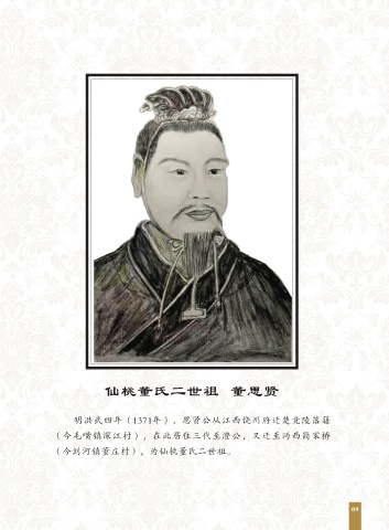 仙桃董氏二世祖 董思贤 明洪武四年(1371年),思贤公从江西饶州府迁楚竞陵落籍 (今毛嘴镇深江村),在此居住三代至澄公,又迁至沔西简家桥 (今剅河镇董庄村),为仙桃董氏二世祖。 09