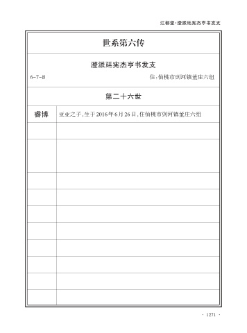 江都堂·澄派廷宪杰亨书发支 世系第六传 澄派廷宪杰亨书发支 6-7-B 住:仙桃市剅河镇董庄六组 第二十六世 睿博 亚亚之子,生于2016年6月26日,住仙桃市剅河镇董庄六组 · 1271 ·