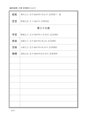 《董氏宗谱》·三修·世系部分·6-8-C 拓拓 利红之子,生于2010年3月21日,住苏湾十一组 艺艺 伟伟之女,生于2013年,住苏湾村 第二十七世 芊艺 辉辉之子,生于2015年11月20日,住苏湾村 芮言 议祥之子,生于2013年2月4日,住苏湾村 志烁 云祥之子,生于2017年9月15日,住苏湾村 姝孆 亮亮之女,生于2016年元月18日,住苏湾村 · 1274 ·