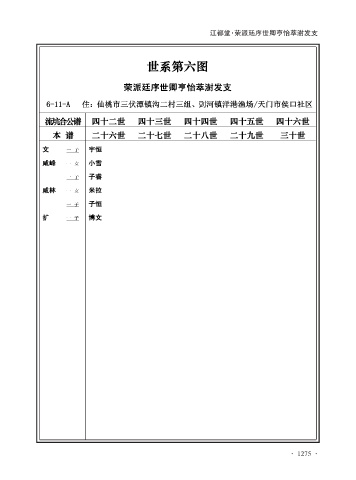 江都堂·荣派廷序世卿亨怡萃澍发支 世系第六图 荣派廷序世卿亨怡萃澍发支 6-11-A 住:仙桃市三伏潭镇沟二村三组、剅河镇洋港渔场/天门市侯口社区 流坑合公谱 四十二世 四十三世 四十四世 四十五世 四十六世 本 谱 二十六世 二十七世 二十八世 二十九世 三十世 文 一 子 宇恒 咸峰 一 女 小雪 一 子 子睿 咸林 一 女 米拉 一 子 子恒 扩 一 子 博文 -1- · 1275 ·