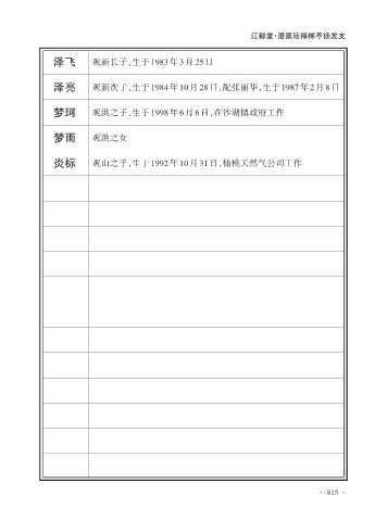 江都堂·澄派廷禄梯亨扬发支 泽飞 观新长子,生于1983年3月25日 泽亮 观新次子,生于1984年10月28日,配张丽华,生于1987年2月8日 梦珂 观洪之子,生于1998年6月6日,在沙湖镇政府工作 梦雨 观洪之女 炎标 观山之子,生于1992年10月31日,仙桃天然气公司工作 · 815 ·