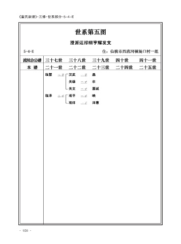 《董氏宗谱》·三修·世系部分·5-4-E 世系第五图 澄派迋䘵栩亨耀发支 5-4-E 住:仙桃市西流河镇堤口村一组 流坑合公谱 三十七世 三十八世 三十九世 四十世 四十一世 本 谱 二十一世 二十二世 二十三世 二十四世 二十五世 临慧 三 子 汉武 一 子 晶 关雄 一 子 壮 关文 一 子 嘉诚 临泽 二 子 观平 一 子 映 观祥 一 子 泽惠 -3- · 920 ·
