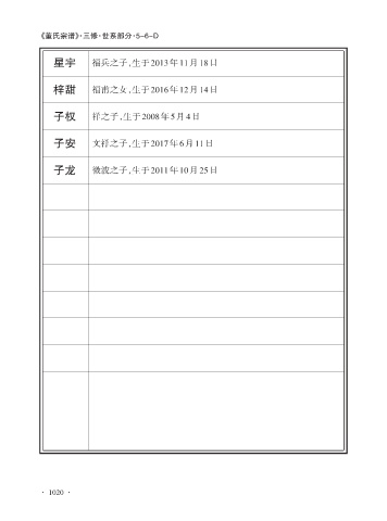 《董氏宗谱》·三修·世系部分·5-6-D 星宇 福兵之子,生于2013年11月18日 梓甜 福甫之女,生于2016年12月14日 子权 祥之子,生于2008年5月4日 子安 文祥之子,生于2017年6月11日 子龙 微波之子,生于2011年10月25日 · 1020 ·