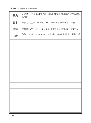 《董氏宗谱》·三修·世系部分·5-8-E 复建之子,生于 2001 年 7 月 16 日,住仙桃市桃园大道 67 号市经信 贤昊 局宿舍 贤卓 智慧之子,生于2004年6月13日,住仙桃市御台公馆12号楼 昊洋 净慧之子,生于2013年2月2日,住仙桃市田园国际2号楼2单元 净慧之女,生于 2019 年 11 月 1 日,住仙桃市田园国际二号楼二单 乐映 元 · 1092 ·