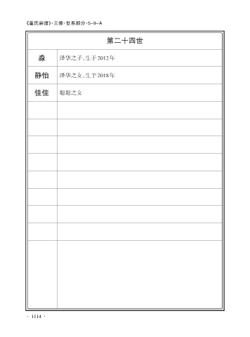 《董氏宗谱》·三修·世系部分·5-9-A 第二十四世 淼 泽华之子,生于2012年 静怡 泽华之女,生于2018年 佳佳 聪聪之女 · 1114 ·